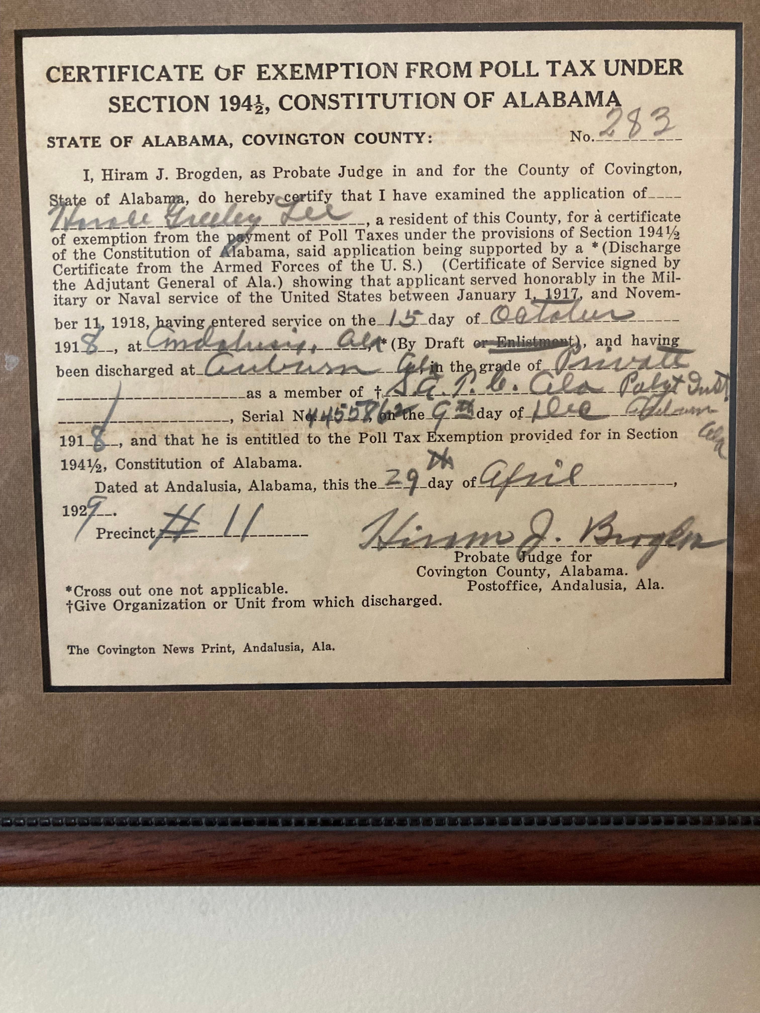 I found a weathered testament to both privilege and misfortune in my father’s things. In a matted frame is my great grandfather’s 1929 exemption from Alabama poll taxes, a boon contingent on his World War I U.S. Army service.